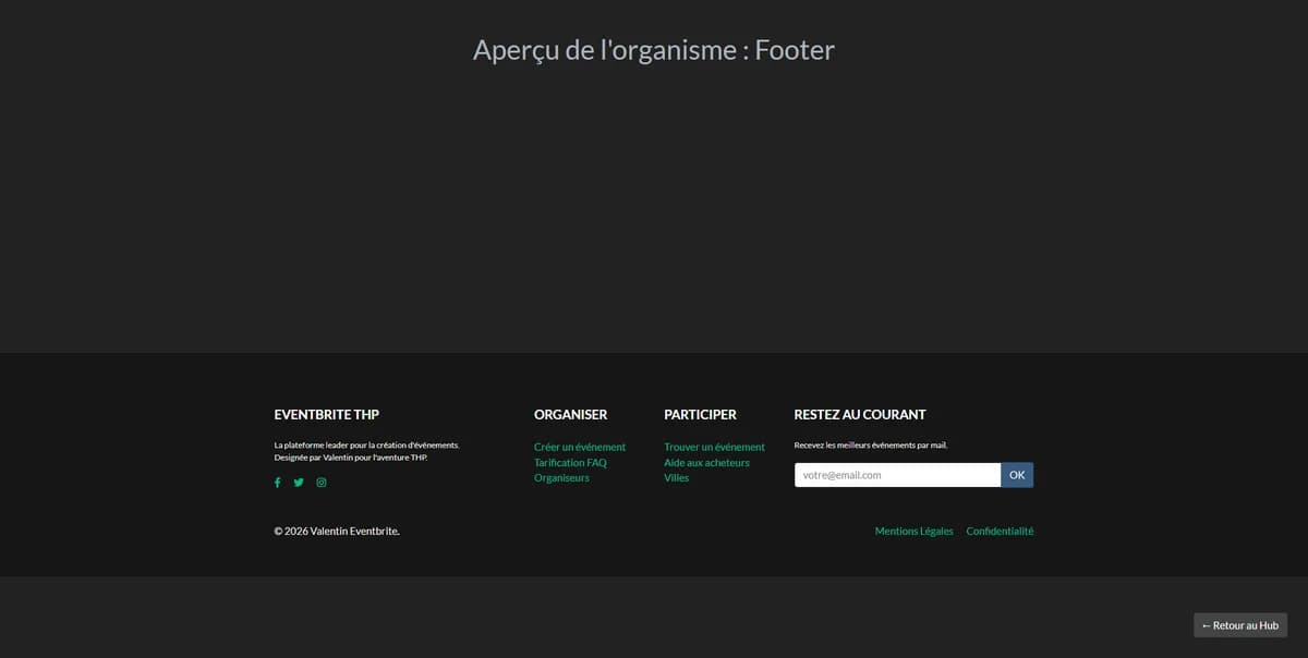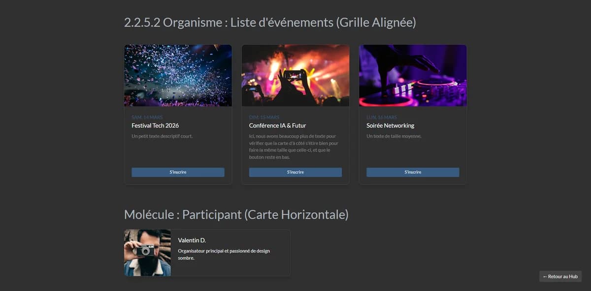 Projet de design system réalisé durant la formation THP. Application de la méthodologie Atomic Design pour construire une bibliothèque de composants cohérente : boutons, formulaires, cartes, navigation, bannières, pricing. Chaque composant est documenté et réutilisable, avec un hub de présentation des éléments.