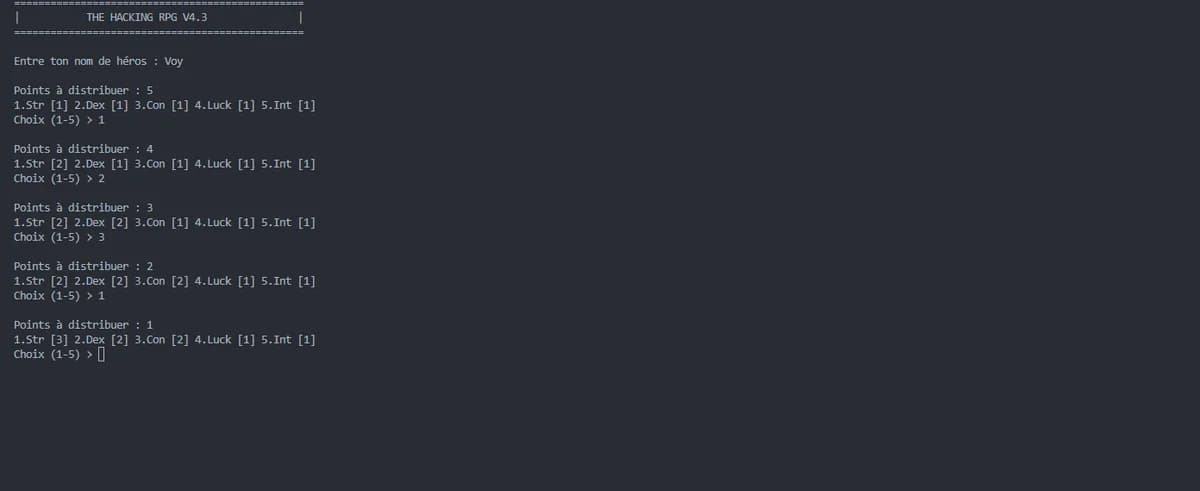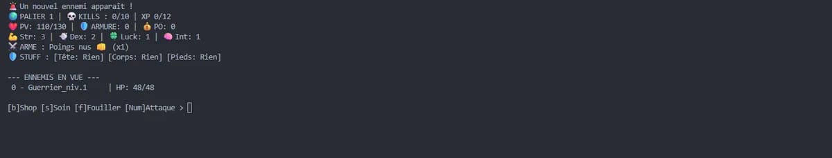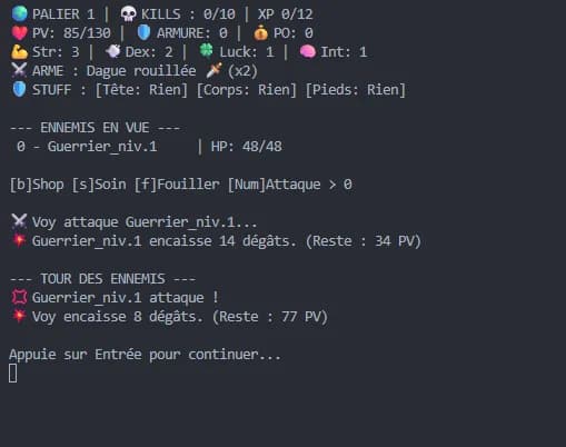 Projet réalisé durant la formation THP. Jeu de rôle entièrement en terminal : le joueur crée son héros en distribuant des points de statistiques (Force, Dextérité, Constitution, Chance, Intelligence), puis s'engage dans des combats au tour par tour contre un adversaire. Logique de combat, gestion des points de vie et fin de partie en Ruby orienté objet.